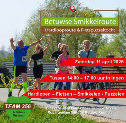 De Betuwse Smikkelroute op zaterdagmiddag 11 april 2026 in Ingen (Verhuizensestraat 8). Door deel te nemen aan De Betuwse Smikkelroute ontdek je de schoonheid van de Betuwe, werk je aan je fitheid en steun je Roparunteam De Betuwe Runners 356 en de goede doelen van de
