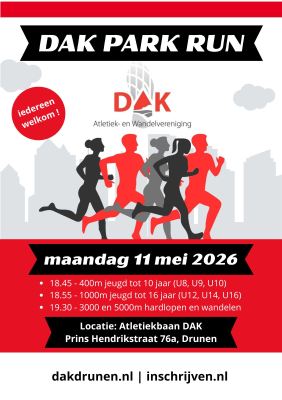 Lijkt het je leuk om een keer met andere lopers actief bezig te zijn. Kom dan op maandagavond 11 mei naar de DAK Park Run op de atletiekbaan van DAK in Drunen.
